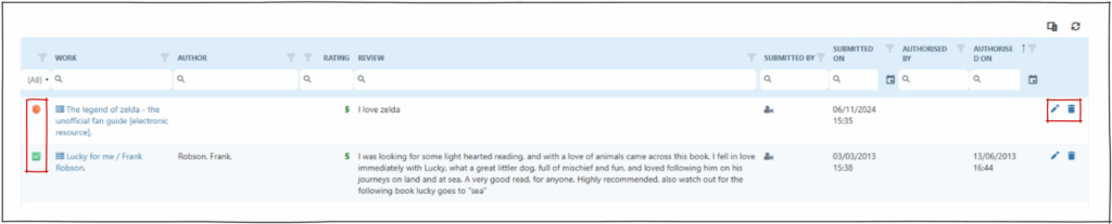 Users may review works in Montage. These appear as ‘unauthorised reviews’ in Astria on both the home page and in Circulation > Authorise Reviews. Operators can edit, approve or delete these reviews as needed.