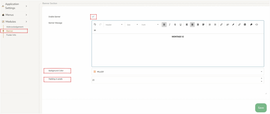 The content of the banner can be edited in the ‘banner message’. Basic formatting tools allow for operators to create impactful content.