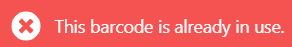 If a barcode has already been assigned to an item the message ‘This barcode is already in use’ will appear in the top right corner.