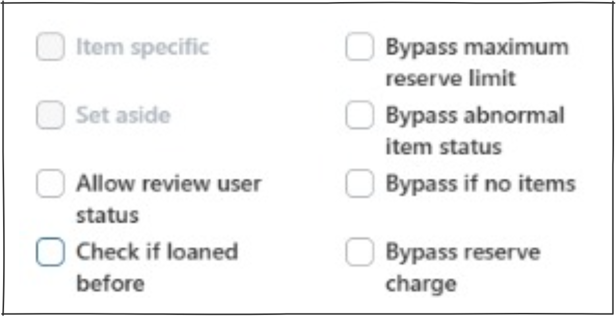 Bypass abnormal item status – The status block e.g. missing, lost, may optionally be overridden using this bypass checkbox.