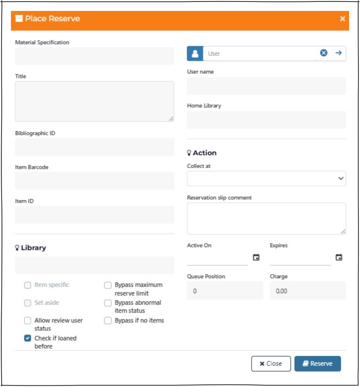 The Item Barcode will be displayed here, if conducting an item specific reserve.