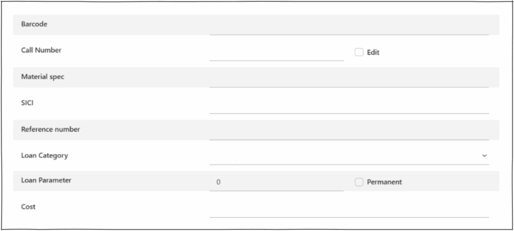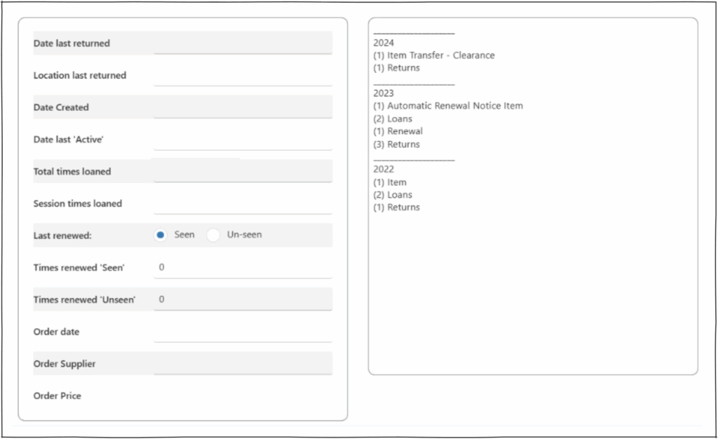 - Total number of times the item has been loaned (overall and in the current ‘session’).