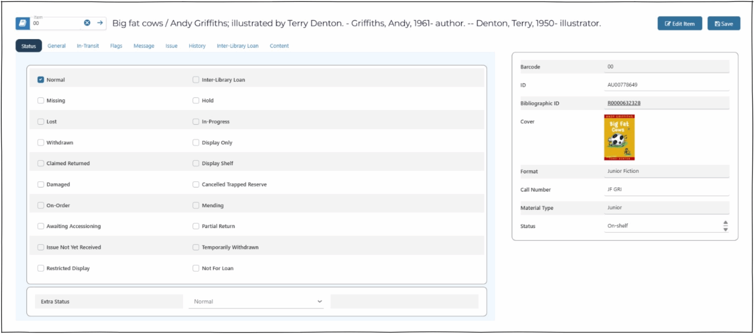 Item statuses can coexistent, a book may be marked as both Damaged and Lost if separately applicable.