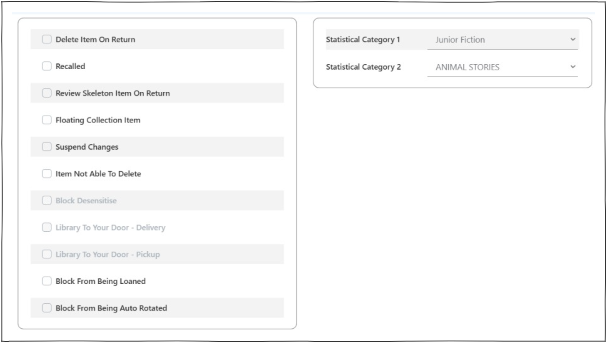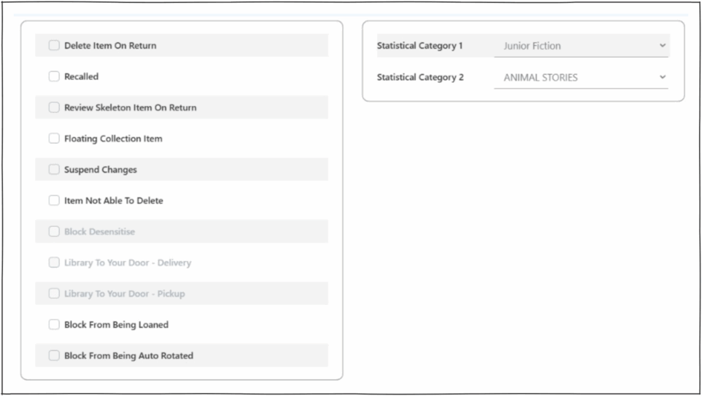 | Review ‘skeleton’ item on Return | This flag is set when an item is created through Quick Work, so that the details can be checked later. As this mechanism implies that the item will be loaned, the flag causes an exception to be raised on return, advising the item be sent to cataloguing. |