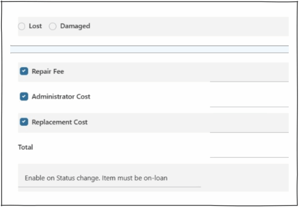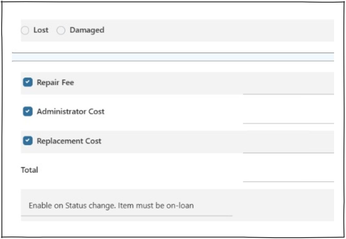 Dependent on the status selected, the radio button for Lost or Damaged will be selected, and the charge amounts will be calculated appropriately: