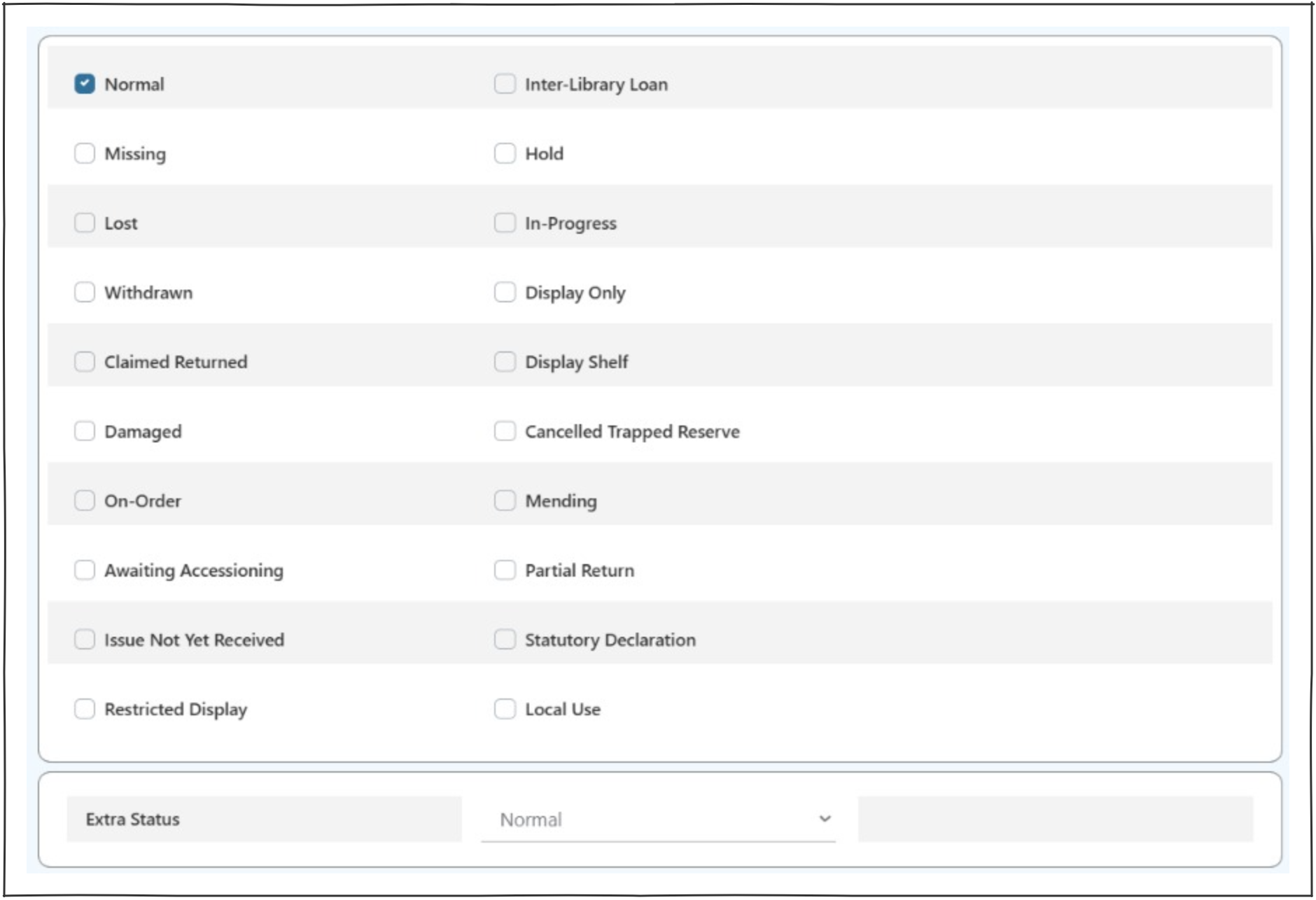 | Withdrawn | Withdrawn status can be applied but this has no special meaning within circulation functions. It does have a special meaning in the context of bulk deletion via Item Transfer, where all items with the status can be gathered automatically and processed for deletion. | Optional Y/N Question | No |