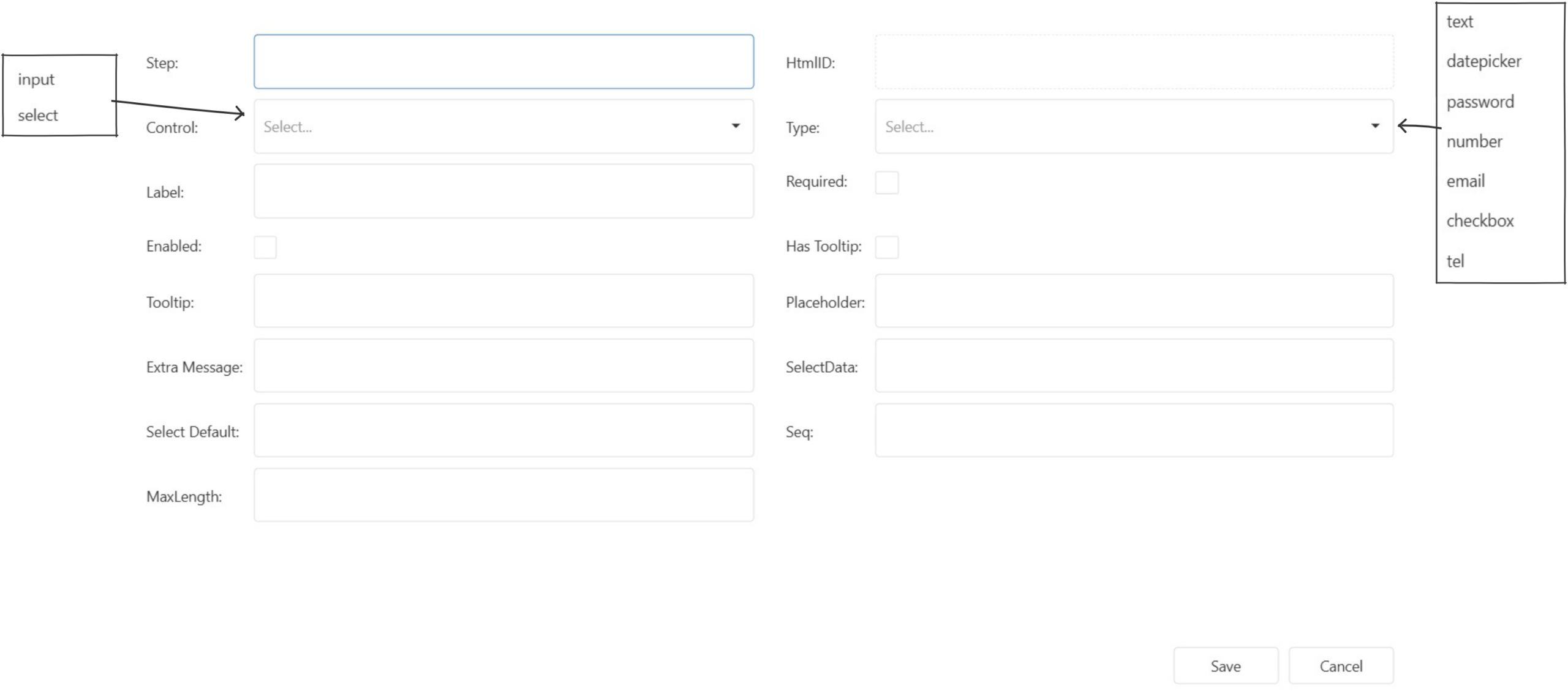 - Type : Relates to control > select (can be text, datepicker, password, number, email, checkbox, tel)