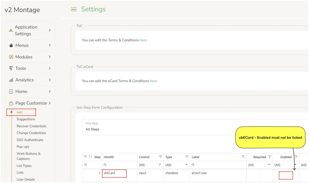 ToC eCard : Operators can edit the eCard Terms & Conditions as they appear on the Conditions of Membership page, via the link on Page Customize > Join > ToC eCard.