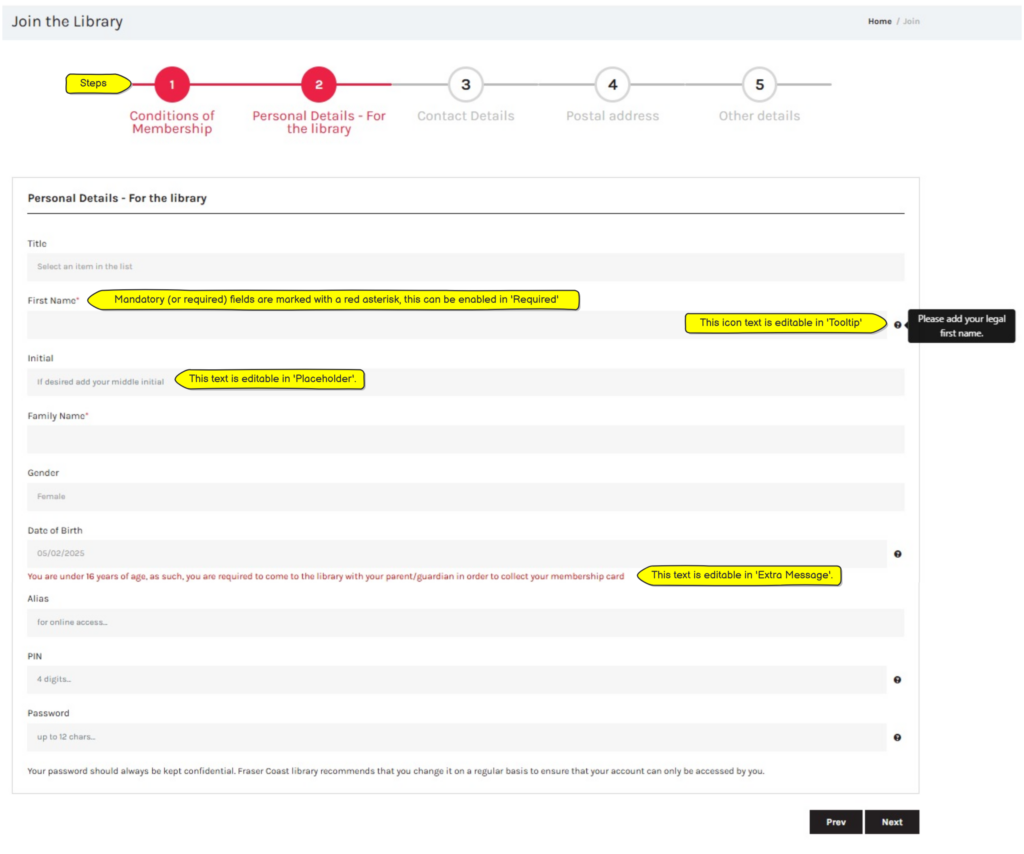 - Extra Message : Adds extra information below the text box. This can be used to advise junior users that they require parental assistance with their membership.