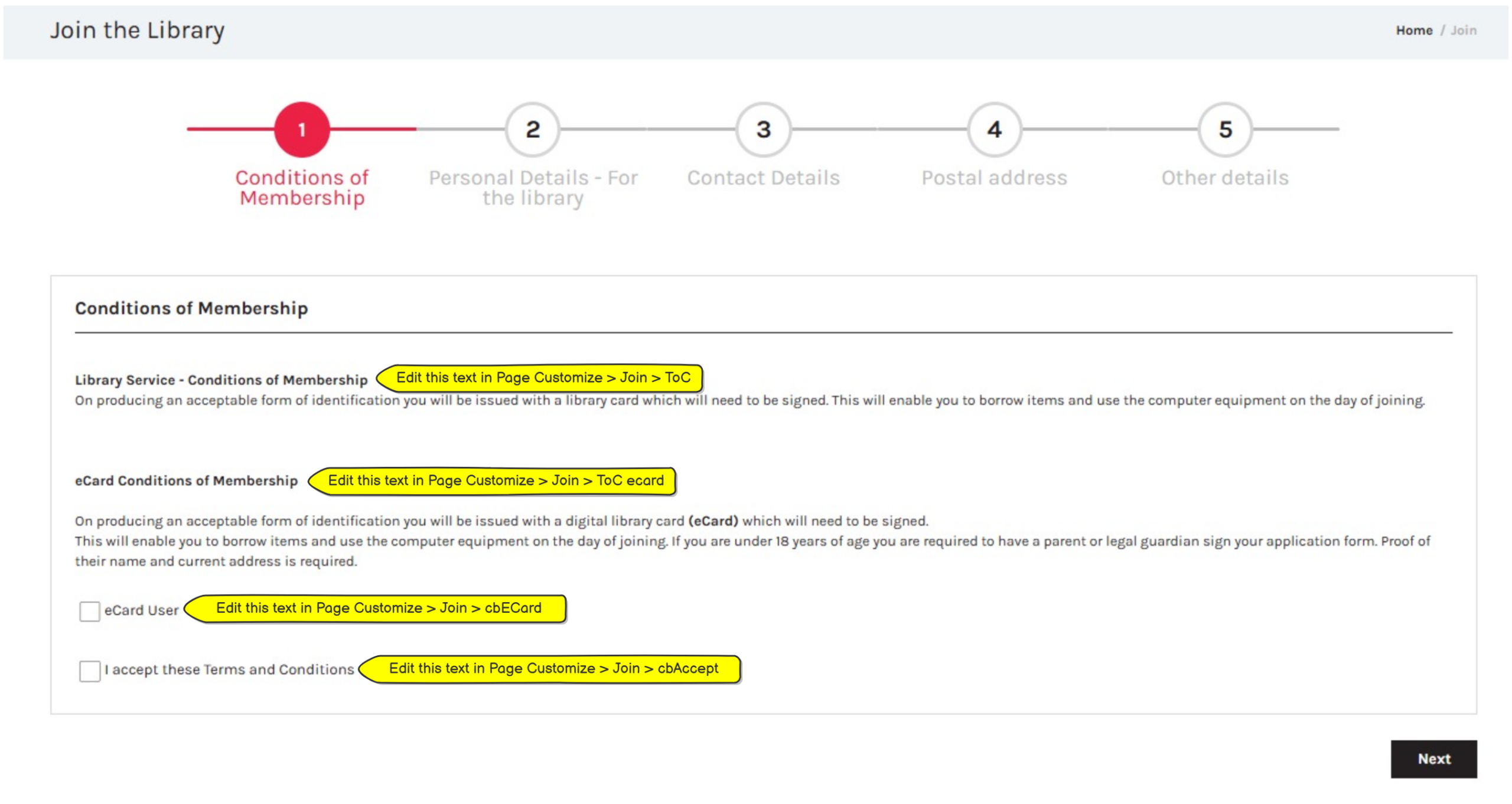 ToC : Operators can edit the Terms & Conditions as they appear on the Conditions of Membership page, via the link on Page Customize > Join > ToC.