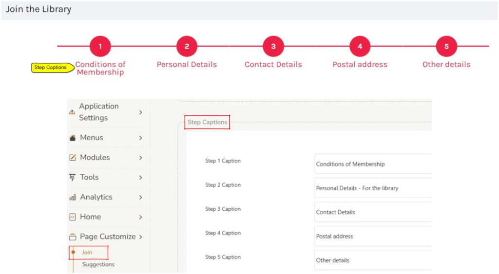 These can each be edited in Page Customize > Join > Step Captions.