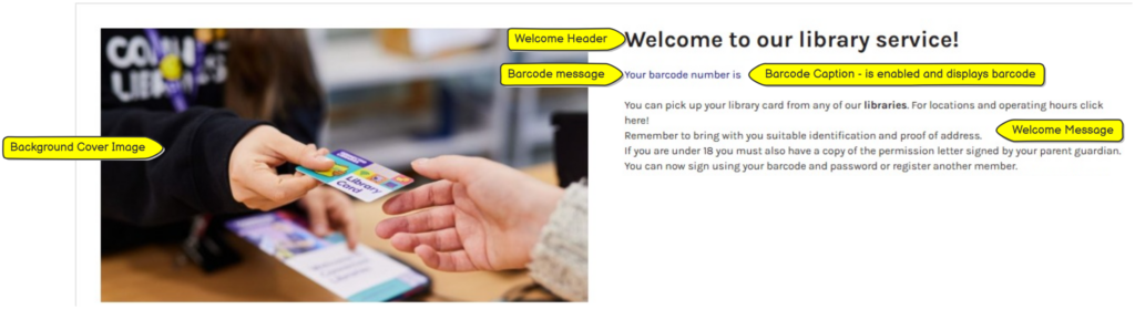 - Welcome message : displays a message from the library for a standard user, can include hyperlinks etc.