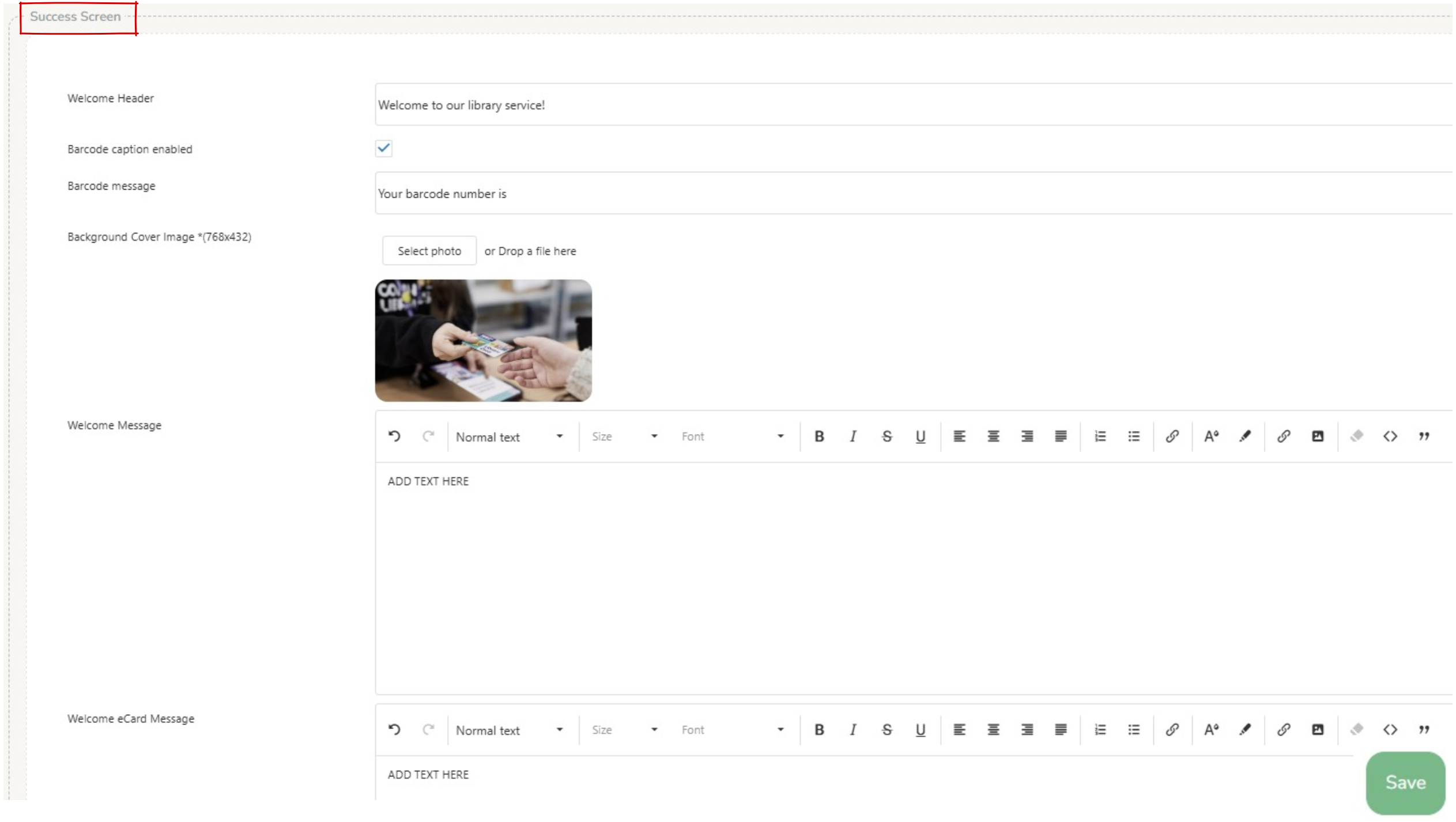 - Welcome eCard message : displays a message from the library for an eCard user, can include hyperlinks etc.