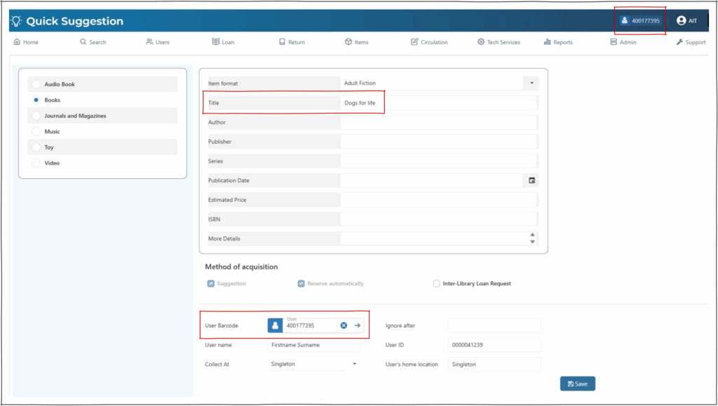 User Barcode – An operator can scan the users barcode into the user barcode box or search via the users name.