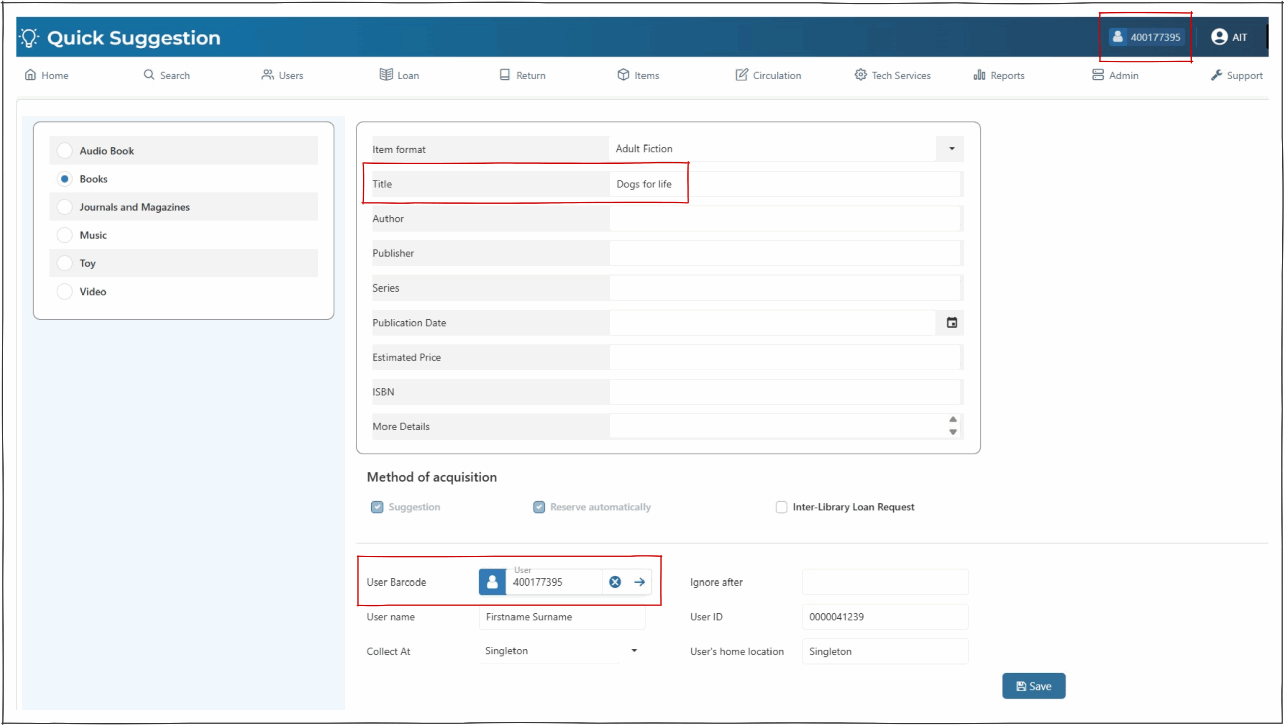 If reserve automatically or Inter-library loan are ticked the user information must be input prior to saving the request.