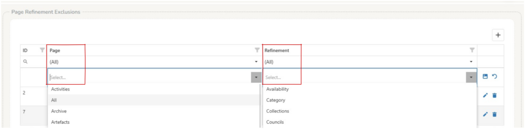 Page refinements exclusions allows operators to identify specific refinements to be omitted from specific pages (eg On the images page the operator does not want the language refinement to present, so they create an exclusion).