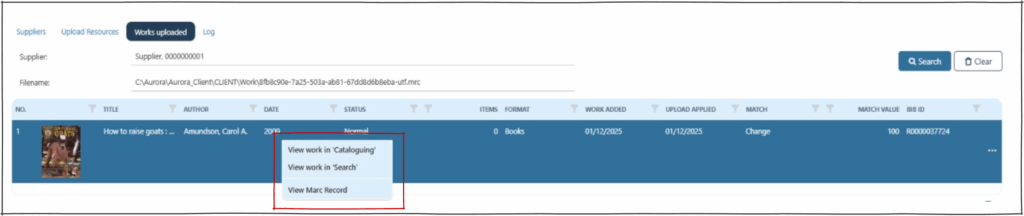View uploaded works in this file – The screen will navigate to the works uploaded tab. The works will display in a grid with information including the Bib ID. Operators can use right click context menu, from this screen, to navigate to the catalogue page.
