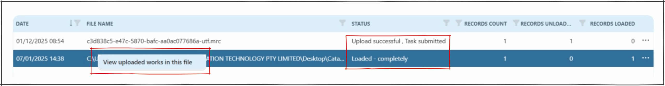 View uploaded works in this file – The screen will navigate to the works uploaded tab. The works will display in a grid with information including the Bib ID. Operators can use right click context menu, from this screen, to navigate to the catalogue page.
