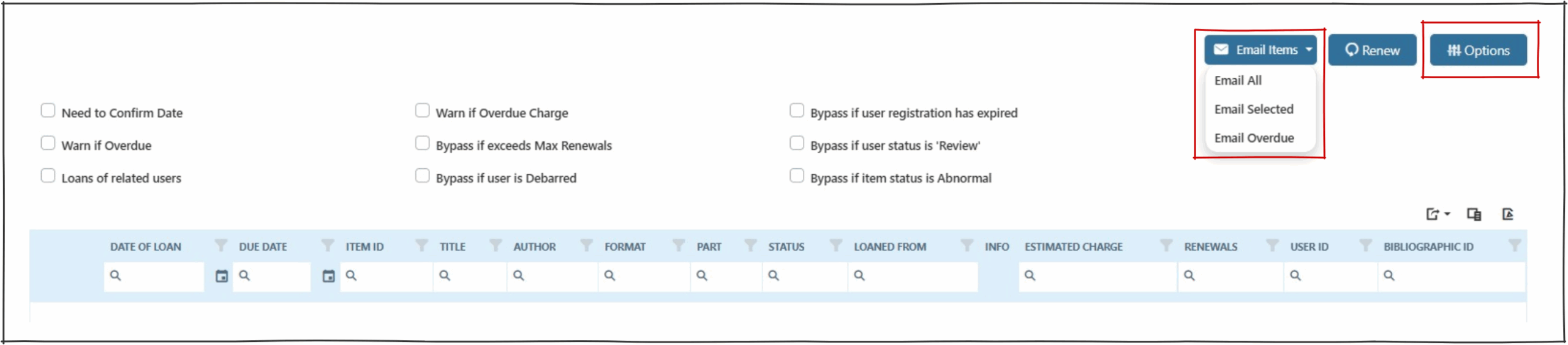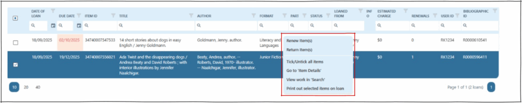 - Tick/Untick all items – This ticks or unticks all rows in the items on loan table.